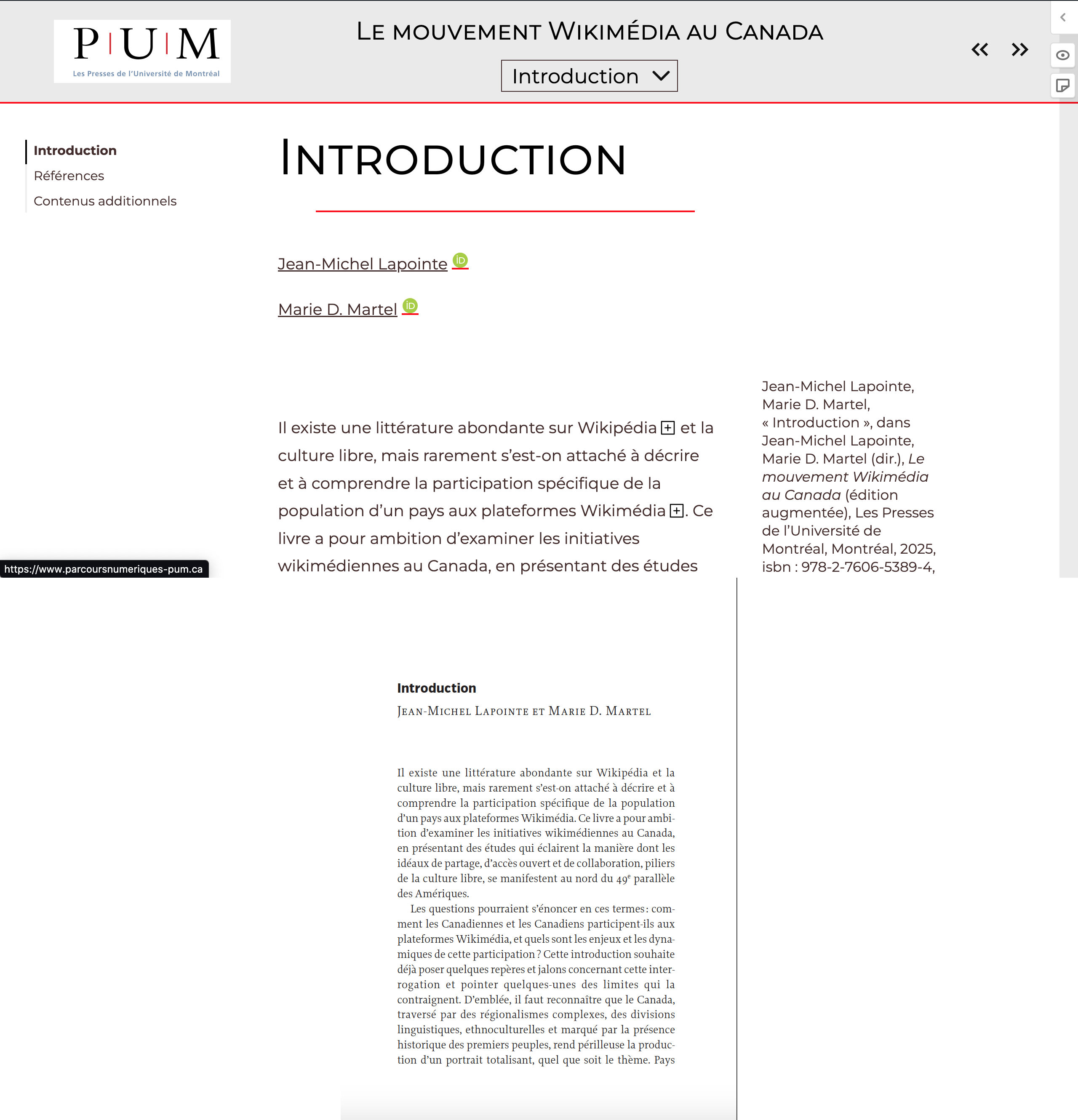 Dans la collection « Parcours Numériques » des Presses de l’Université de Montréal, nous publions les livres en accès libre aussi bien dans leurs versions web (partie supérieure de l’image) que dans leurs versions PDF (partie inférieure de l’image), permettant deux modes de lecture différents – et complémentaires ? – des ouvrages.